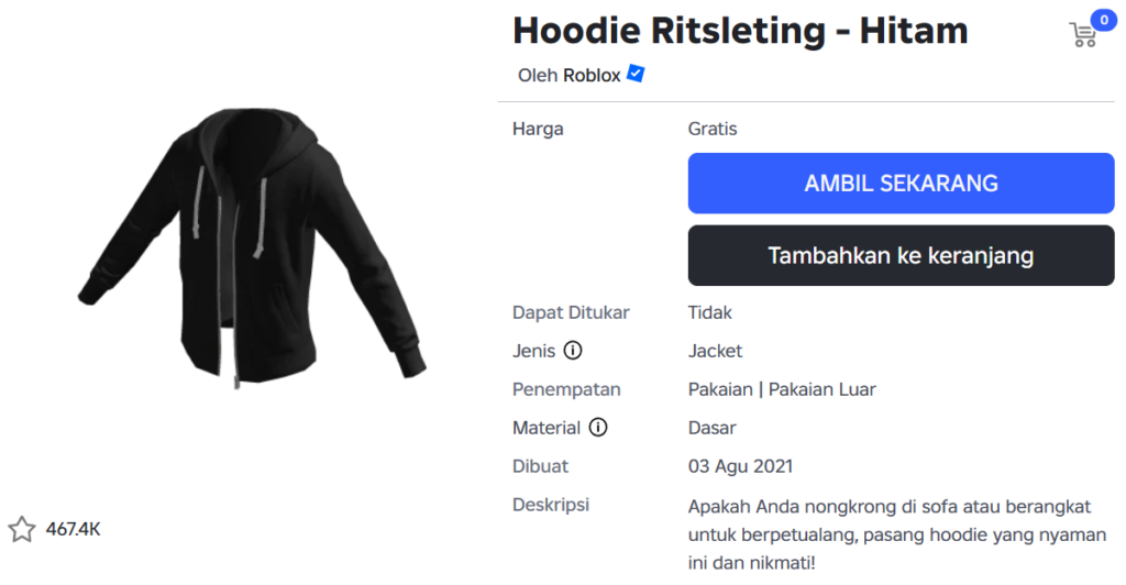Ya, Zip Hoodie Black tersedia gratis di Roblox Catalog tanpa perlu Robux sama sekali. Kamu cukup login ke akun Roblox dan klik tombol Get di halaman itemnya.